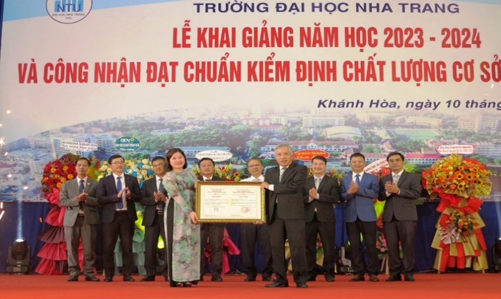 Đại diện Trung tâm Kiểm định chất lượng giáo dục - ĐH Quốc gia TPHCM trao Giấy chứng nhận kiểm định chất lượng giáo dục cho Trường Đại học Nha Trang.